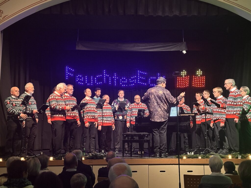 Unser dies jähriges Adventskonzert war ein großer Erfolg und erfreute sich einer sehr guten Besucherzahl. Das Feuchte Eck präsentierte ein abwechslungsreiches Programm aus traditionellen und modernen Advents- und Weihnachtsliedern, darunter Klassiker wie „Es kommt ein Schiff geladen“ und stimmungsvolle Highlights wie „Cantique de Noël“ und „That’s Christmas To Me“. Die Lieder wurden nicht nur gesungen, sondern auch auf charmante Weise angesagt und mit kurzen Einblicken in ihre Inhalte, Ursprünge oder Bedeutungen erklärt, was beim Publikum sehr gut ankam.