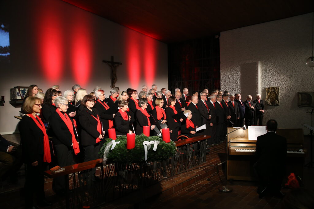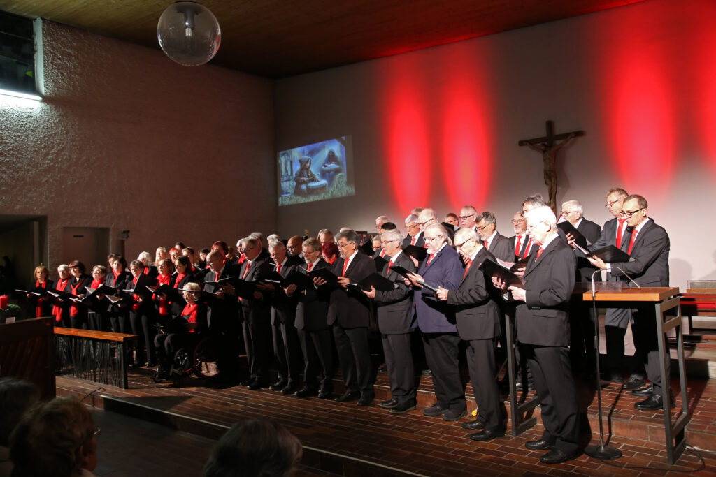 Mit einer Mischung aus Besinnlichem und Beschwingtem stimmte der Sängerbund Ruit am Abend des 2. Advent, 7. Dezember die Zuhörerinnen und Zuhörer in der vollbesetzten Kath. Kirche St. Monika in Ostfildern-Ruit auf die Weihnachtszeit ein. „Herbei, o ihr Gläubigen“ und „Ehre sei Gott in der Höhe“ nach Sätzen von Silcher, präsentiert vom gemischten Chor, bildeten den musikalischen Rahmen des 90minütigen Adventszaubers, dazwischen Bachs „Ich steh an deiner Krippen hier“ und Weisen aus England („Wer ist das Kind“) und Tschechien („Trommellied“). Im Galopp und mit Schellenglocken gings für den Männerchor dann auf die beschwingte „Petersburger Schlittenfahrt“, gefolgt vom melancholischen „A la Nanita“. Der Frauenchor unter Sabine Frömke besang die „Heil`ge Nacht“ nach der bekannten Weise von Adolphe Adam, und stimmte dann in die rhythmischen Klänge von Ruth Morris Grays „Sing with the Angels“ ein. Hirten- und Weihnachtslieder aus Venezuela und Spanien und José Felicianos Weihnachtshit „Feliz Navidad“ bildeten einen weiteren Schwerpunkt des gemischten Chores, der ebenso wie der Männerchor von Claudia Großekathöfer dirigiert wurde. Ihr oblag auch die Gesamtleitung. Am Klavier begleitete die Chöre Michael Kuhn.