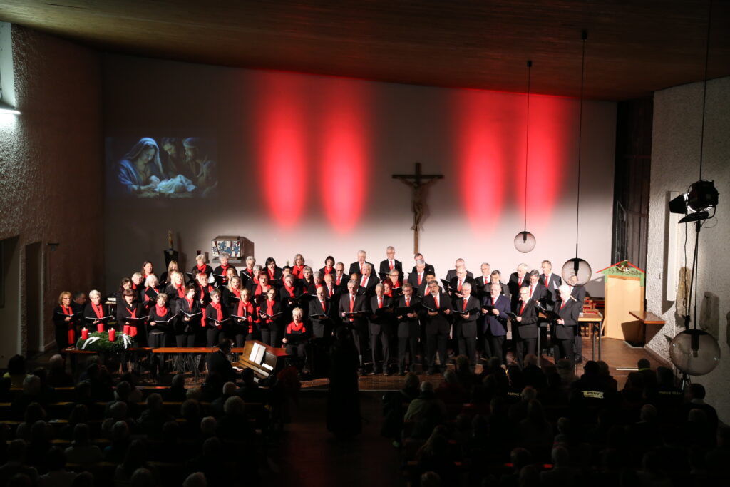 Mit einer Mischung aus Besinnlichem und Beschwingtem stimmte der Sängerbund Ruit am Abend des 2. Advent, 7. Dezember die Zuhörerinnen und Zuhörer in der vollbesetzten Kath. Kirche St. Monika in Ostfildern-Ruit auf die Weihnachtszeit ein. „Herbei, o ihr Gläubigen“ und „Ehre sei Gott in der Höhe“ nach Sätzen von Silcher, präsentiert vom gemischten Chor, bildeten den musikalischen Rahmen des 90minütigen Adventszaubers, dazwischen Bachs „Ich steh an deiner Krippen hier“ und Weisen aus England („Wer ist das Kind“) und Tschechien („Trommellied“). Im Galopp und mit Schellenglocken gings für den Männerchor dann auf die beschwingte „Petersburger Schlittenfahrt“, gefolgt vom melancholischen „A la Nanita“. Der Frauenchor unter Sabine Frömke besang die „Heil`ge Nacht“ nach der bekannten Weise von Adolphe Adam, und stimmte dann in die rhythmischen Klänge von Ruth Morris Grays „Sing with the Angels“ ein. Hirten- und Weihnachtslieder aus Venezuela und Spanien und José Felicianos Weihnachtshit „Feliz Navidad“ bildeten einen weiteren Schwerpunkt des gemischten Chores, der ebenso wie der Männerchor von Claudia Großekathöfer dirigiert wurde. Ihr oblag auch die Gesamtleitung. Am Klavier begleitete die Chöre Michael Kuhn.